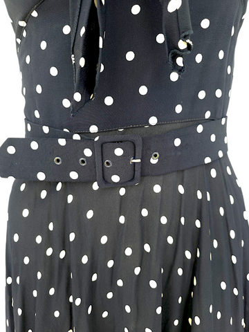 Navy Blue Blumarine polka dot dress featuring a belt and tie up detail on the bust. Features a zip on the back.
