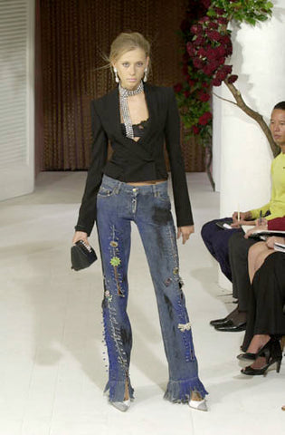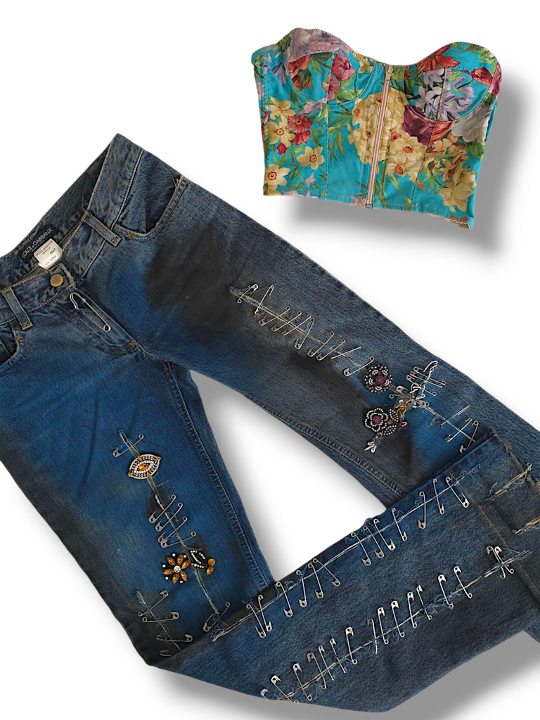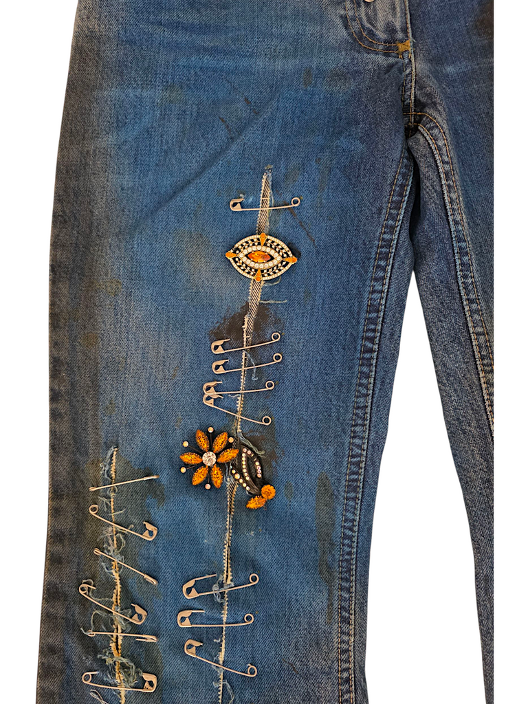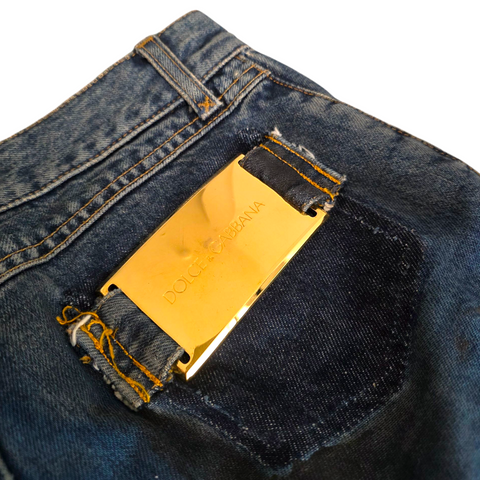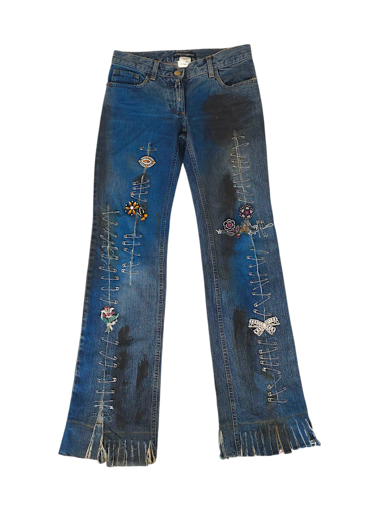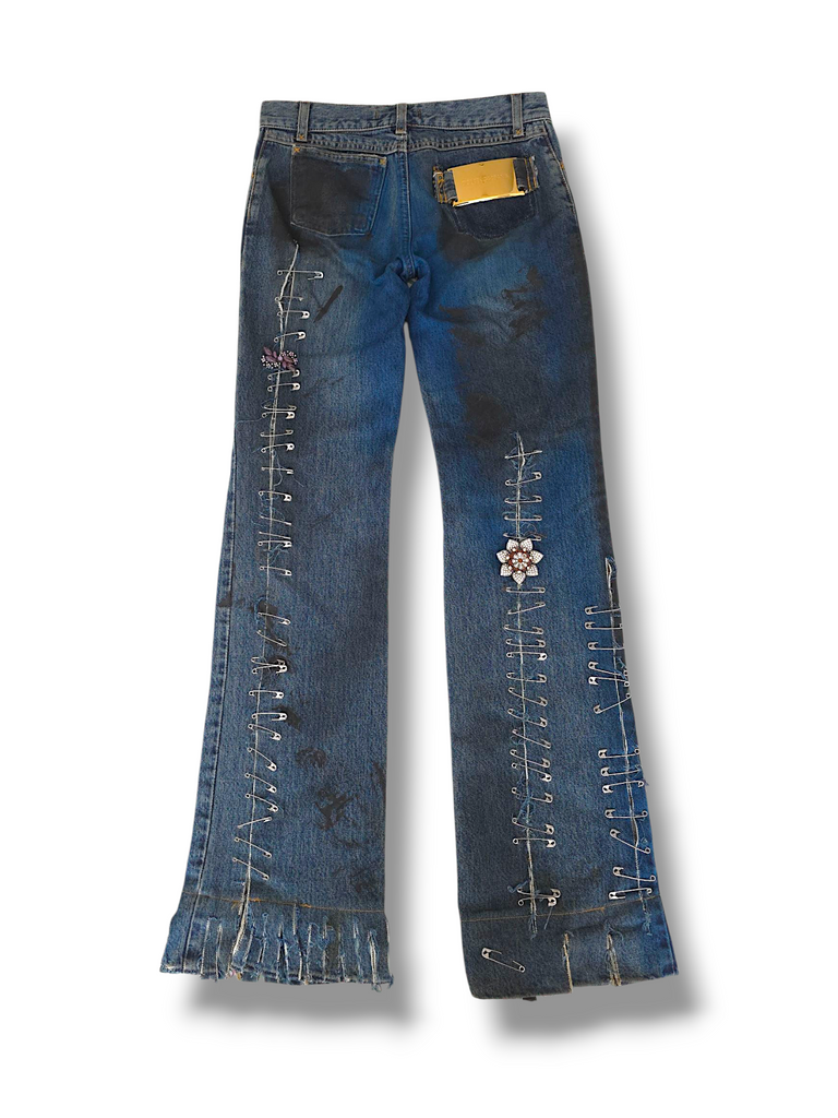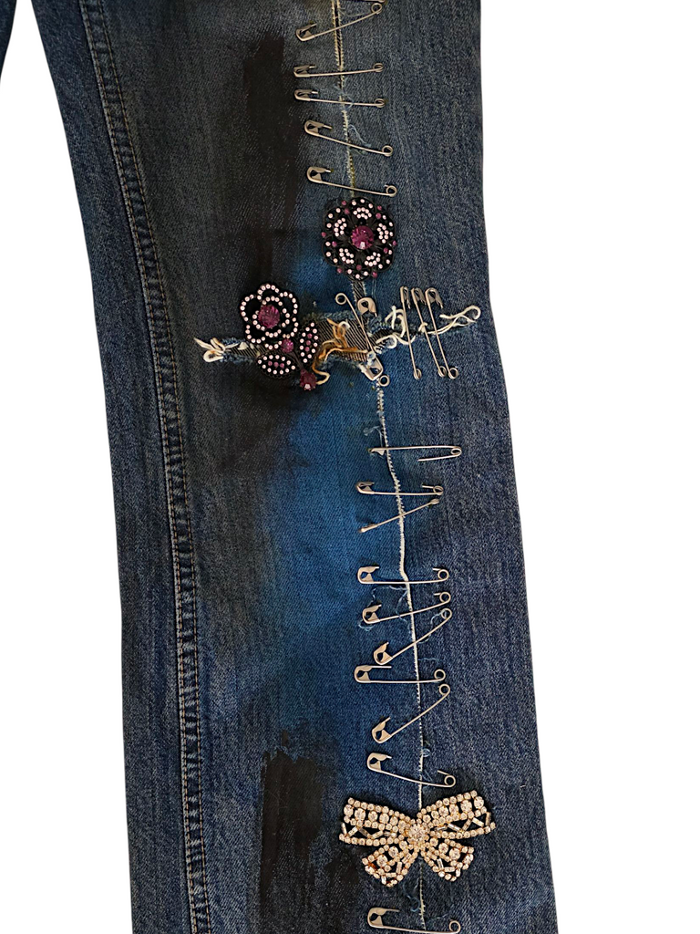 Dolce & Gabbana SS 2001 low-rise indigo painted denim pants with safety pins and crystal broches. throughout and cash wash pleated hem. Gold plated buckle on right back pocket with the logo imprinted. Embellished pants were seen on more than five model at their runway show, it was the main piece of the show.