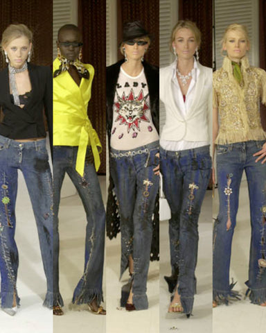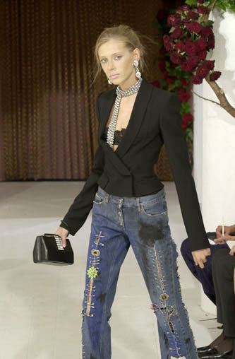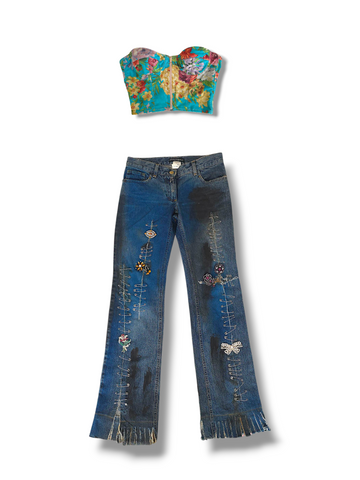 The jeans are from the Dolce Gabbana SS 2001 collection. The same top was seen on Victoria Beckham in February 1999 so likely to be from the 1999 collection. The bra version of the top was worn in the same colour way by Kelly Rowland.