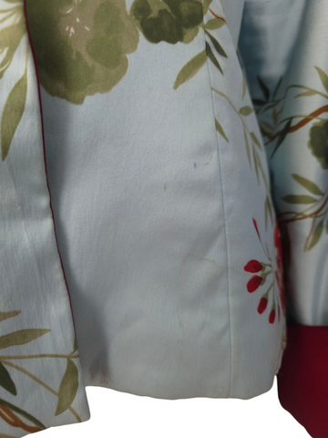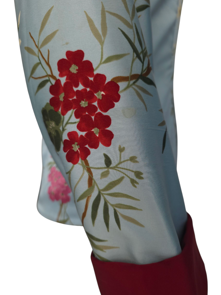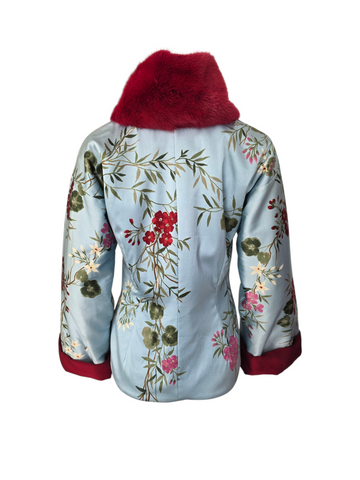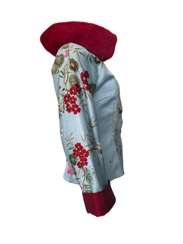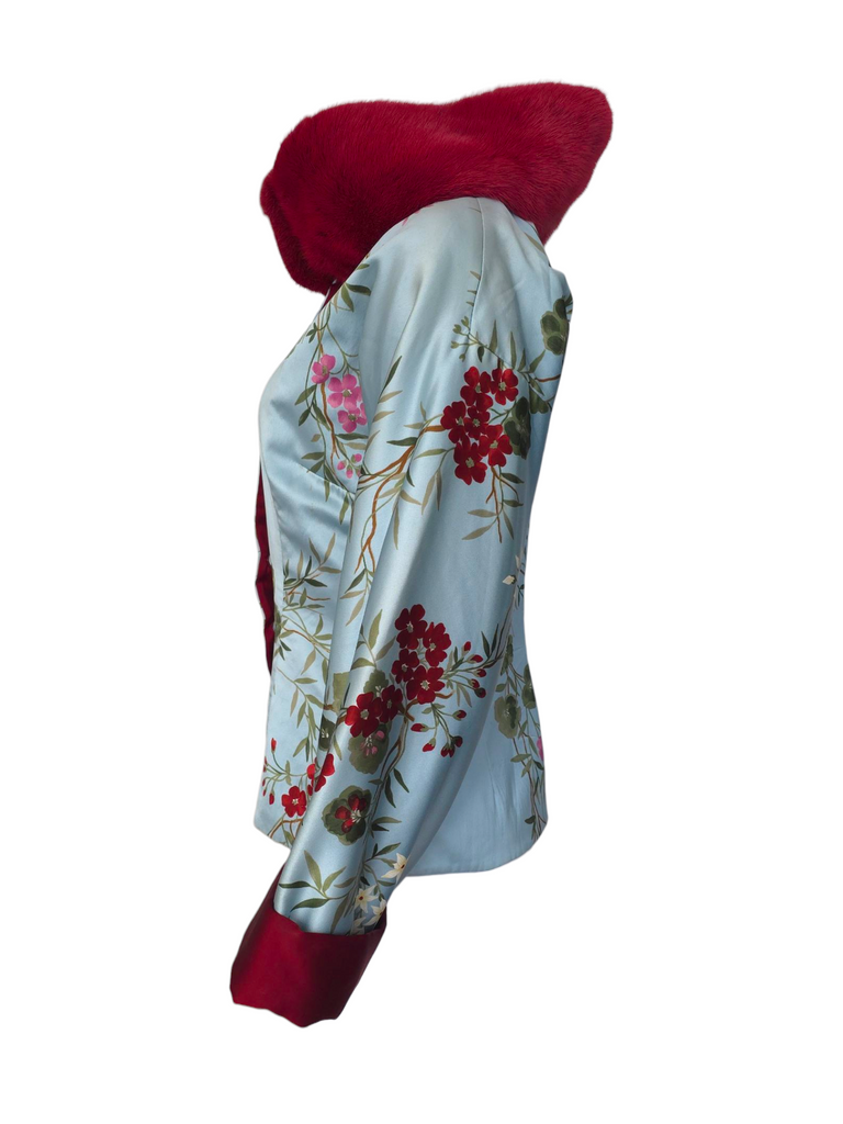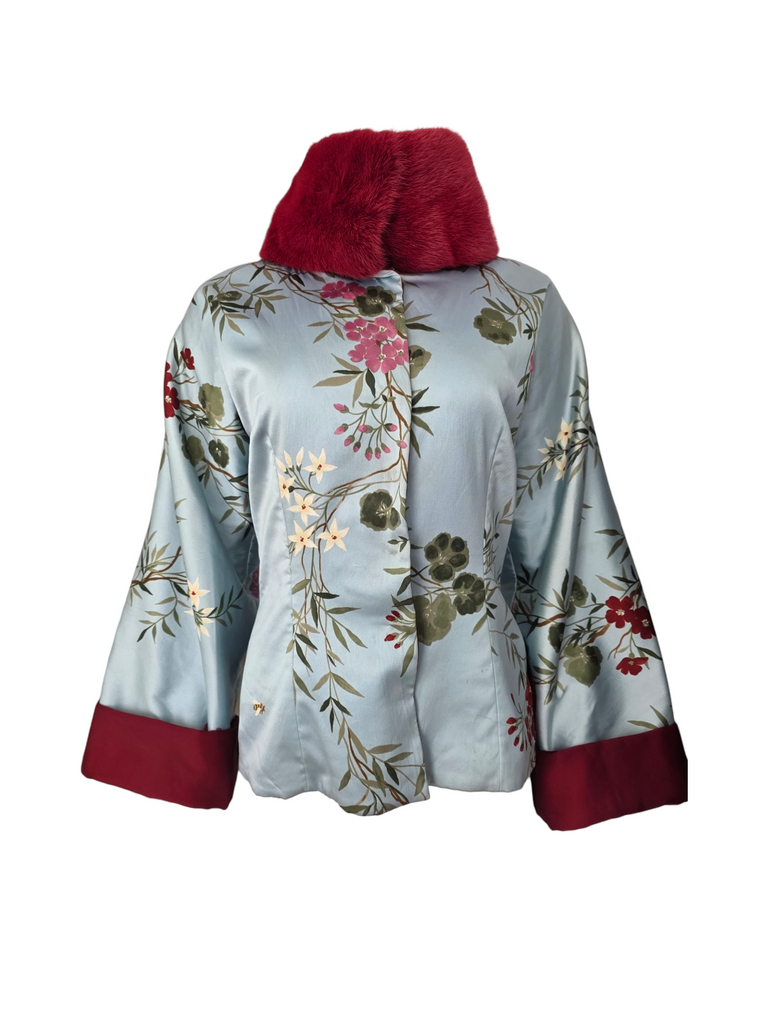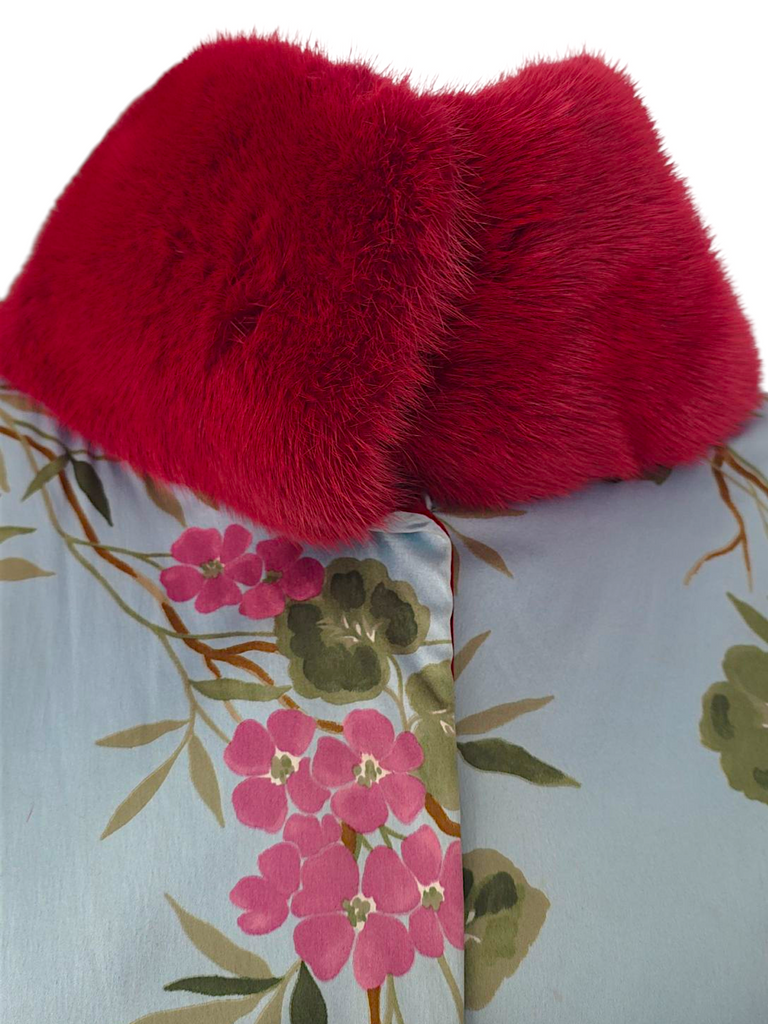This Dolce & Gabbana evening jacket is crafted from luxurious blue silk, hand-painted with intricate floral designs in shades of burgandy and green. The coat is complemented by a burgandy mink fur trim at the wide collar and burgandy silk at the turn-up cuffs, adding an opulent touch. Features snap enclosure buttons.
