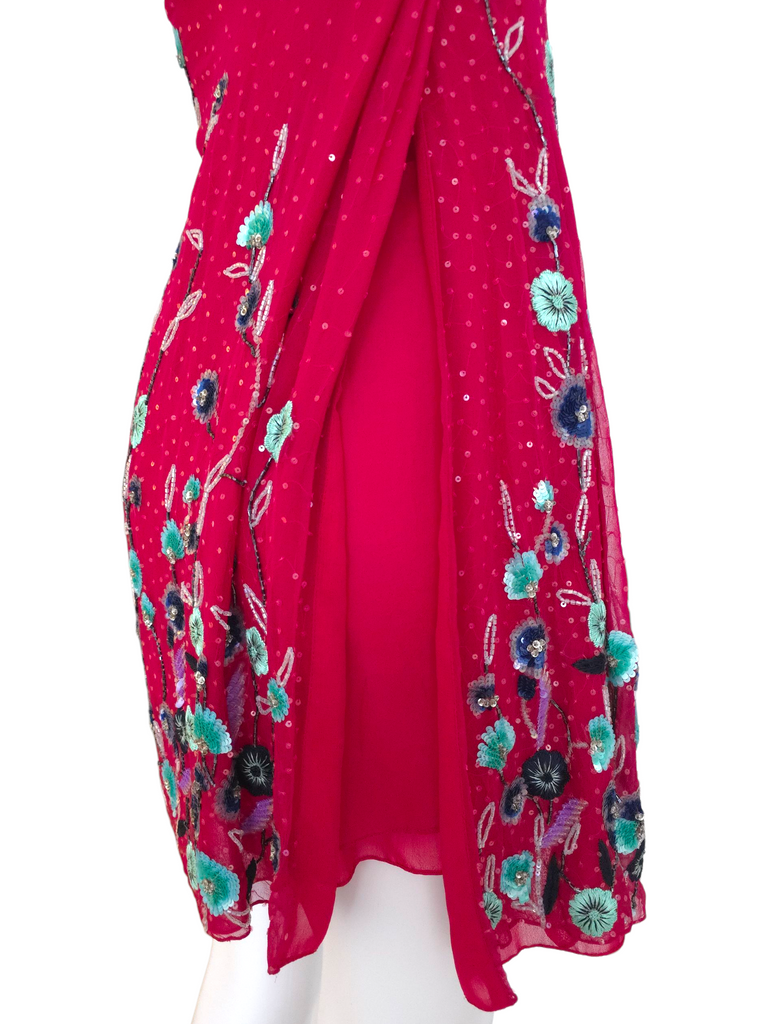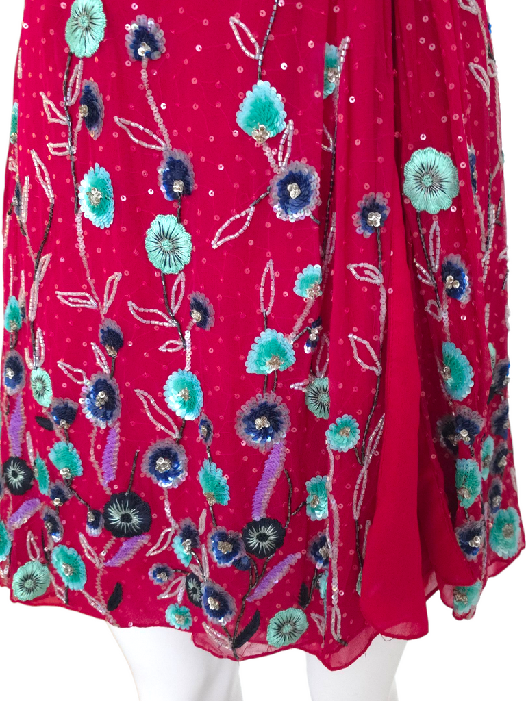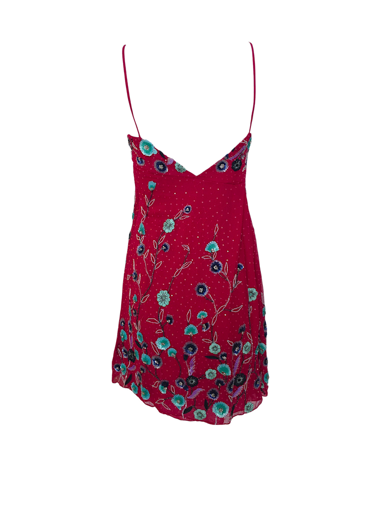 Beautiful and heavily embellished red runway dress from the Emporio Armabi SS 2003 collection. Features a side zip. Also features draping on the front left and back right as seen in the close up photos.