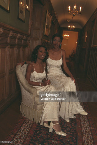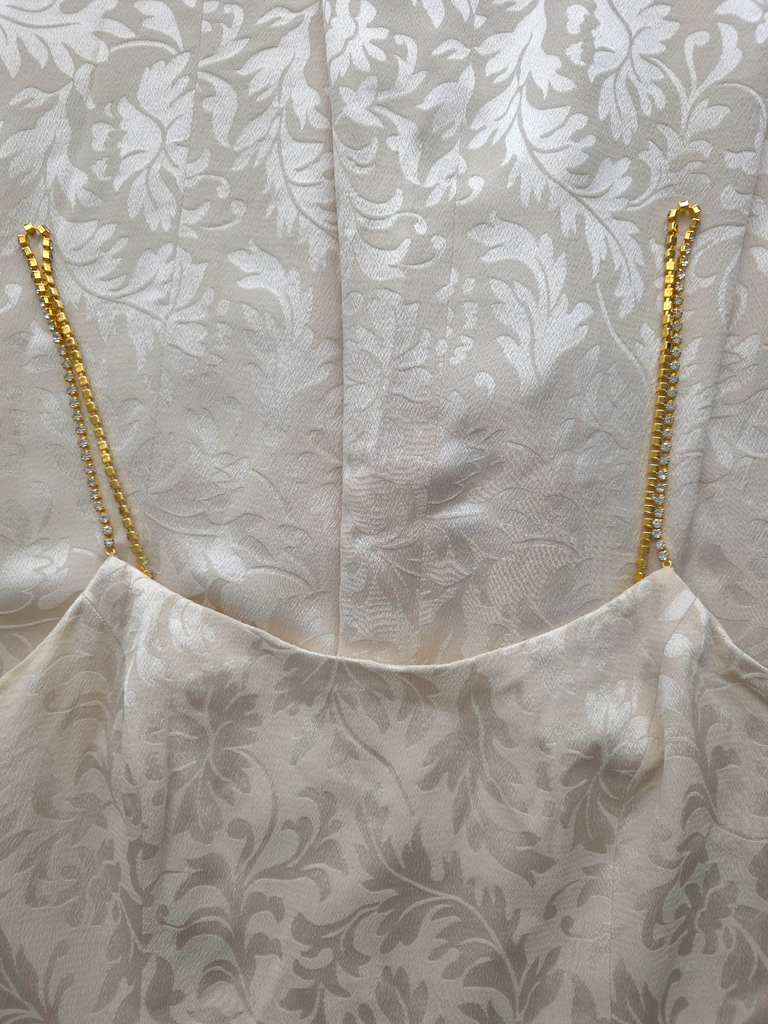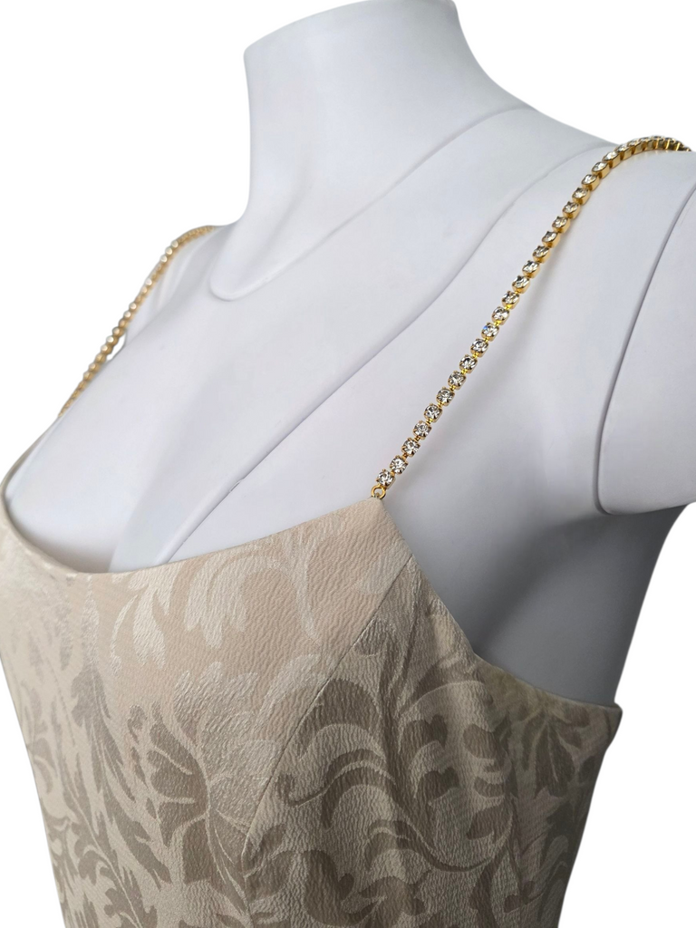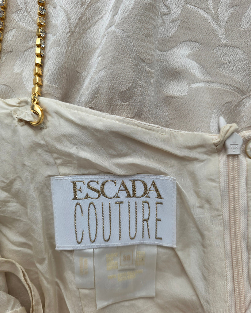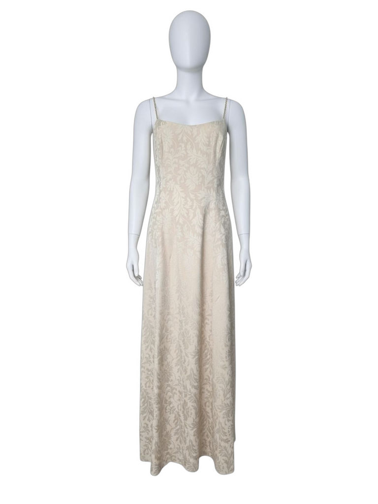 A romantic cream gown with a subtle barroco print and diamanté straps. From the Escada 1997 collection.