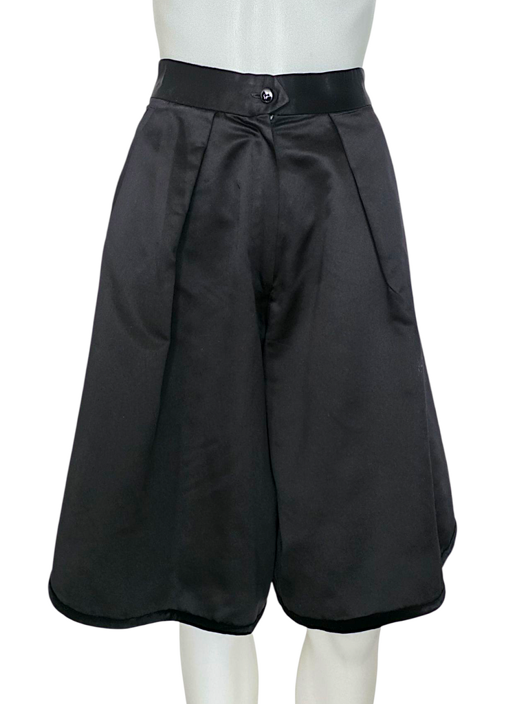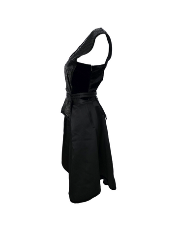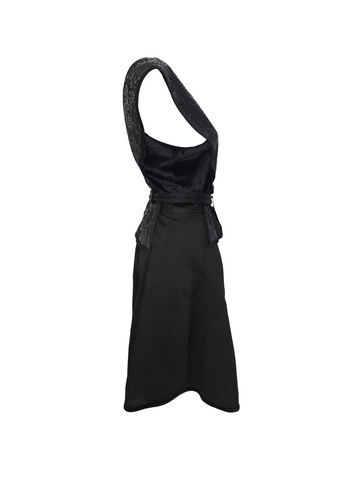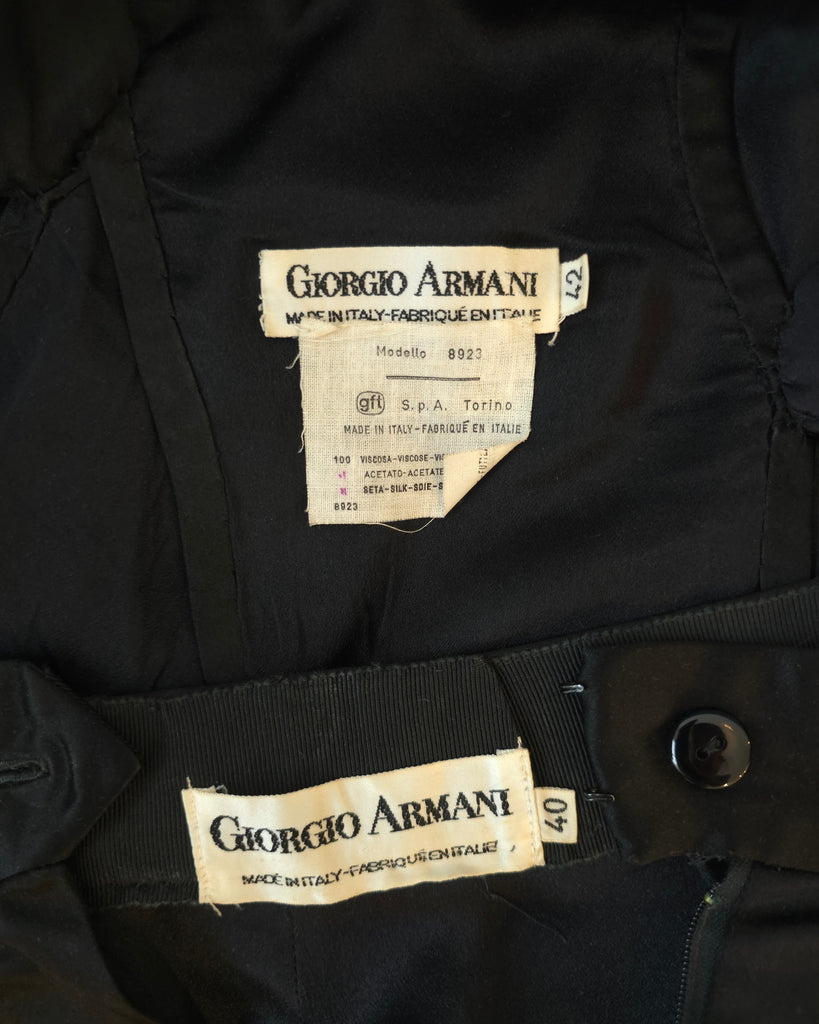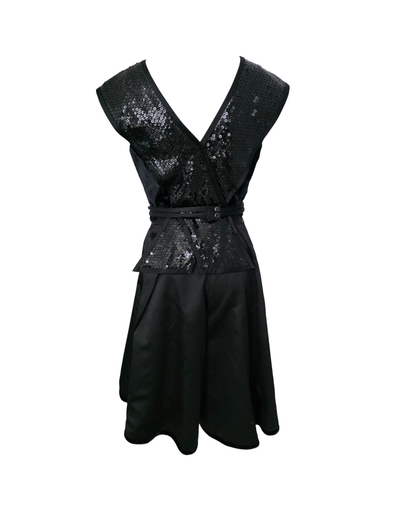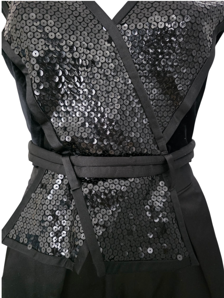 An elegant black two piece sequin top and short ensemble from Giorgio Armani. Shorts feature a velvet trim and velvet side panels on the top. The top features a zip on the side.
