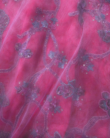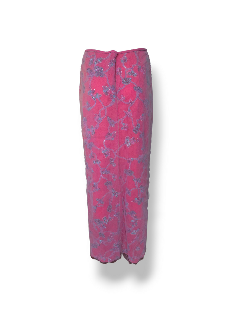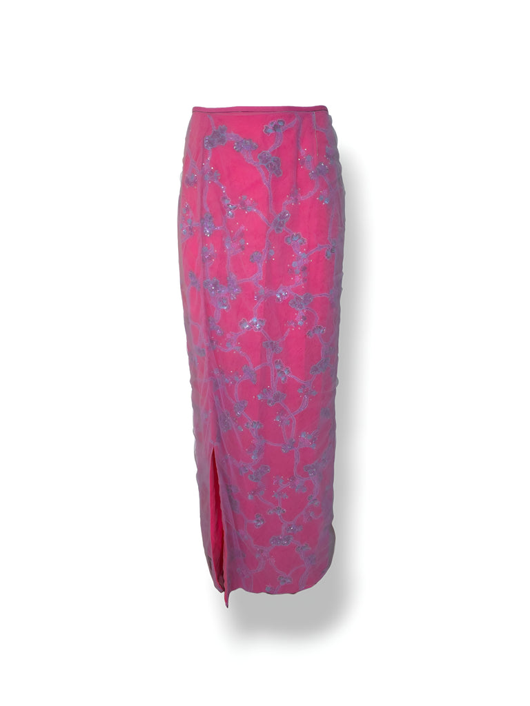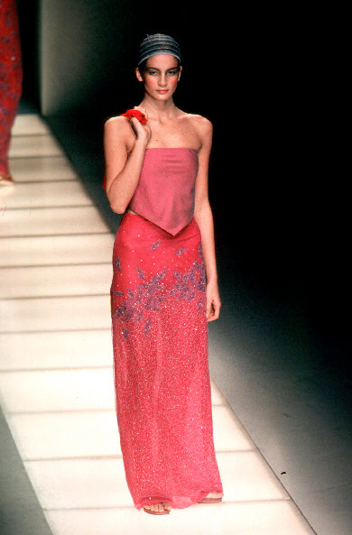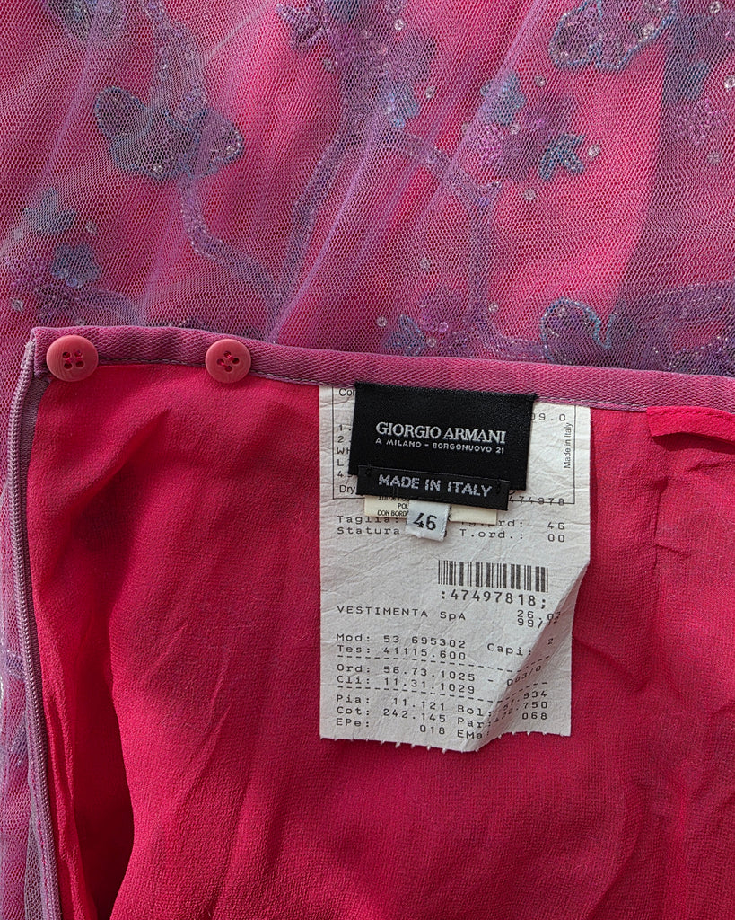 S/S 1999 Giorgio Armani Runway Pink Floral Beaded Tulle Overlay Maxi Skirt.