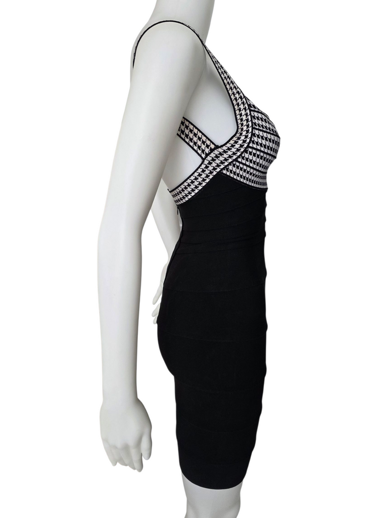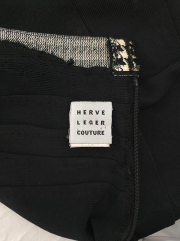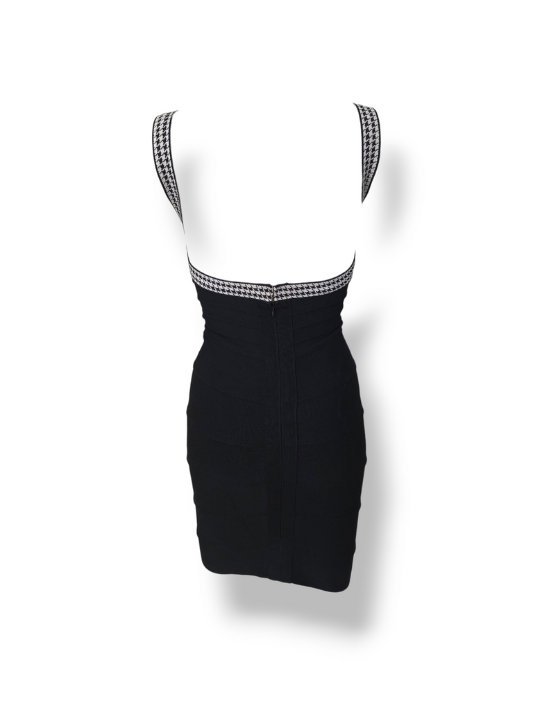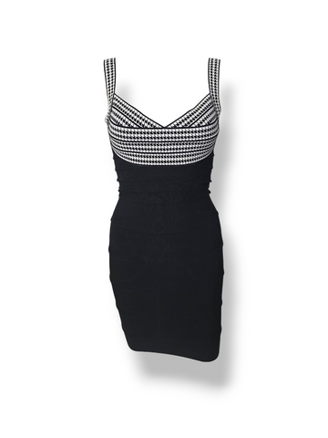 The upper part of the dress features a white and black houndstooth pattern with a sweetheart or neckline and a zip on the back.