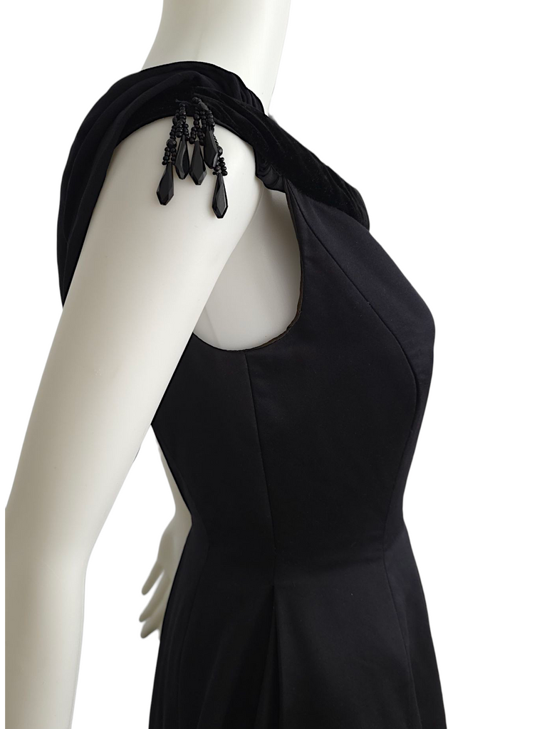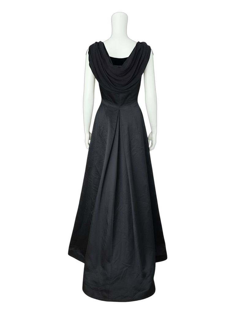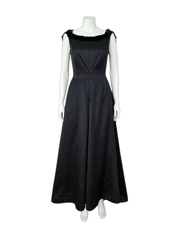A beautiful elegant 90s Valentino gown featuring a long train. Features a velvet trim neckline and decorative stones from the shoulders. Features a side zip.