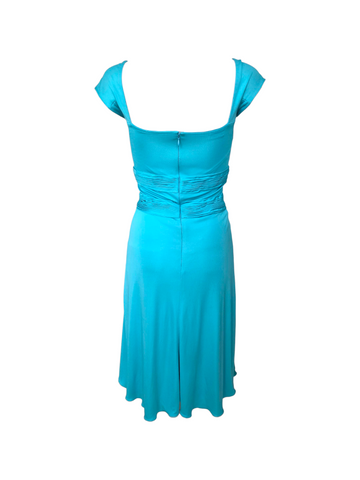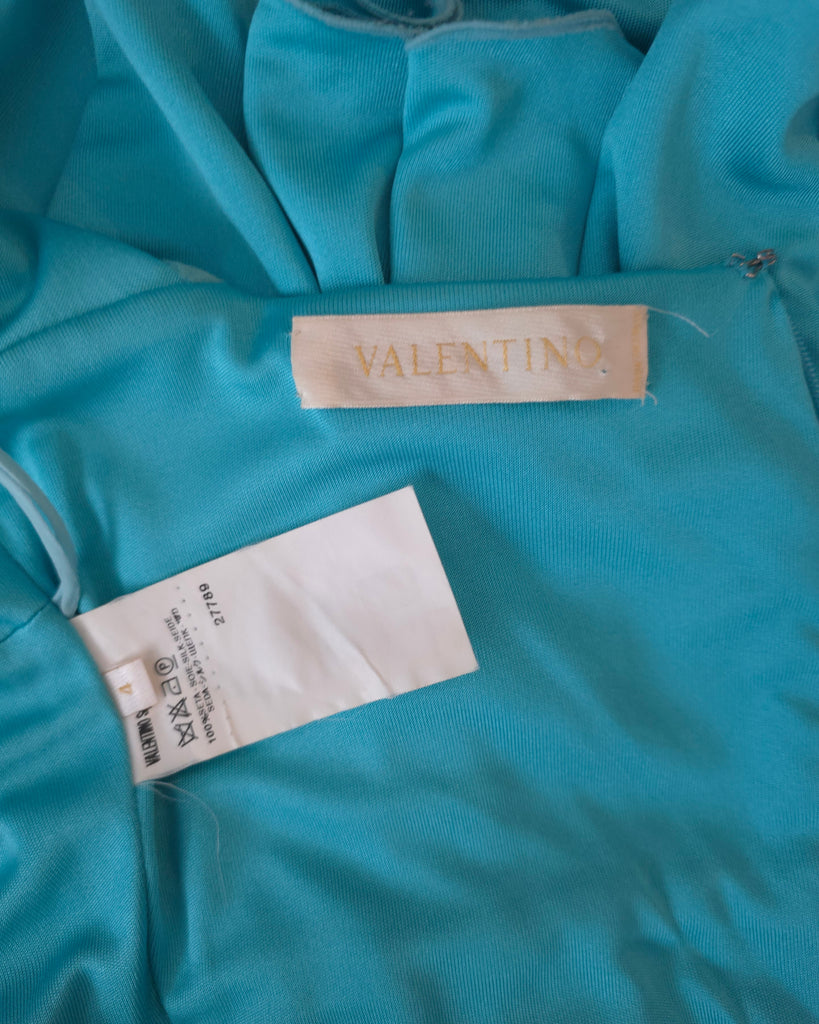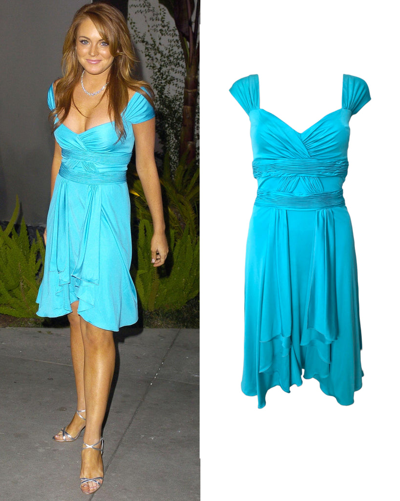 The most famous dresses from the Valentino SS 2004 collection and one of Lindsay Lohans most well known red carpet looks from the 2000s. The dress was seen on the runway and in the ad campaign in the white colourway but worn in Turquoise blue by Lindsay.
