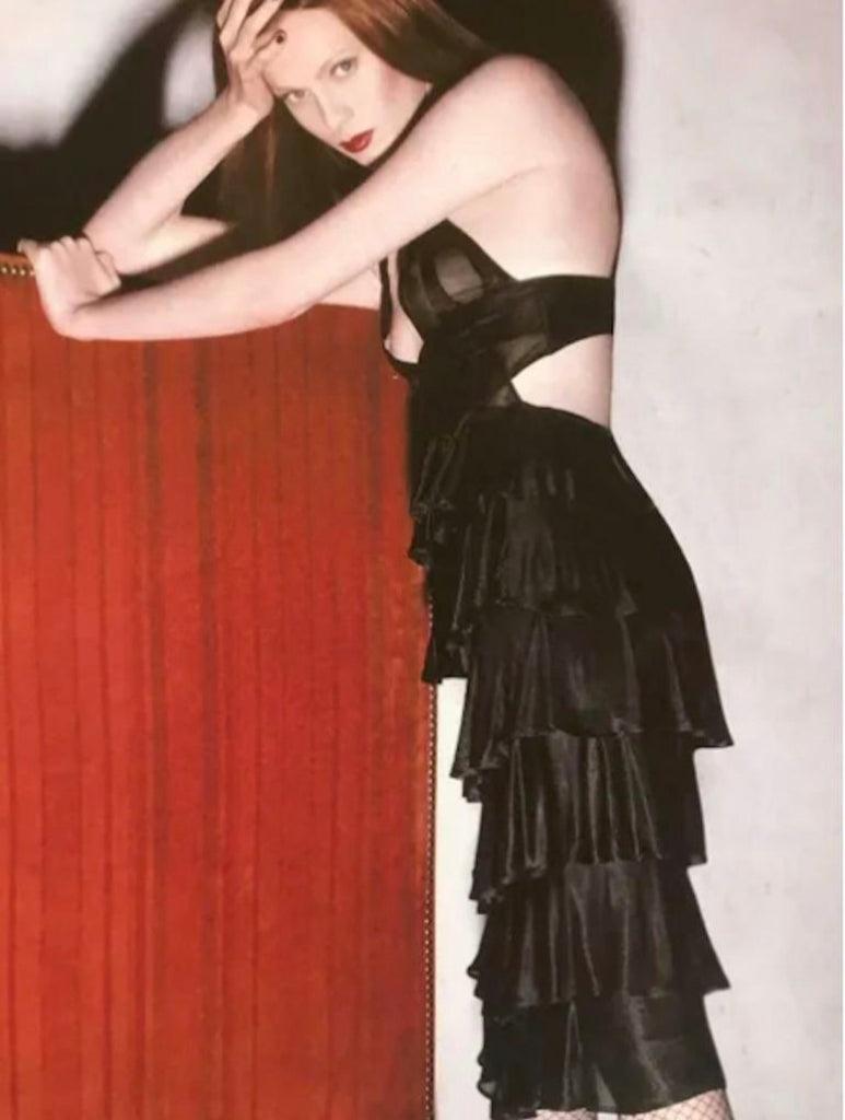 Yves Saint Laurent Tom Ford F/W 2003 bra cut out semi sheer black ruffle dress as seen on the runway. The dress was danousot worn by Britney Spears in 2003 to a Rolling Stone party.
